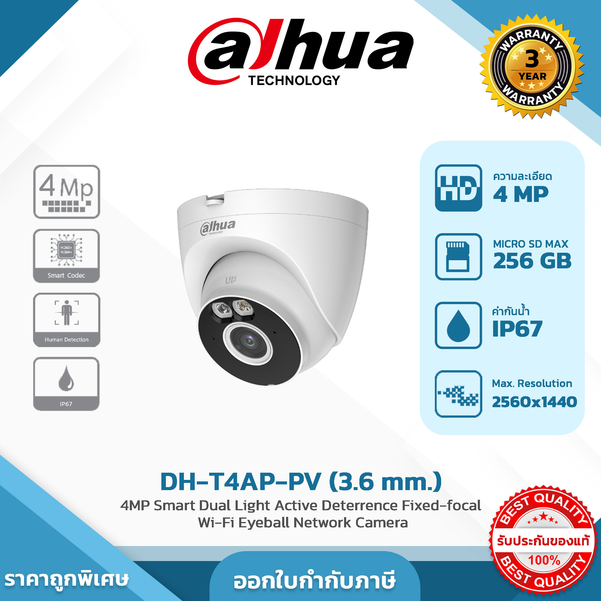 DAHUA กล้องวงจรปิด WIFI รุ่น DH-T4A-PV 4MP Fixed-focal Wi-Fi Turret Network Camera