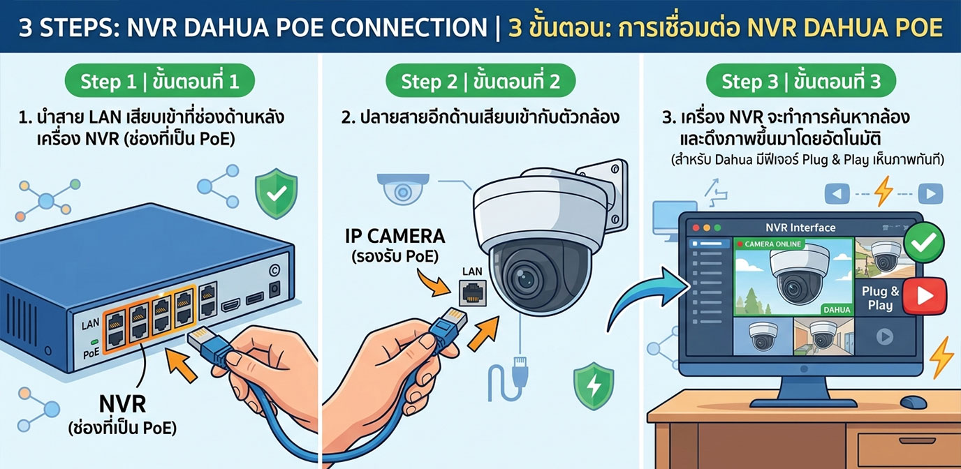 | หัวข้อเปรียบเทียบ | NVR แบบธรรมดา (Non-PoE) | NVR Dahua POE |